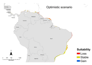 Figura 3. Modelos de distribuição do boto-cinza em dois cenários de mudanças climáticas para 2060: cenário mitigado (figura à esquerda) e não-mitigado (figura à direita). Nesses mapas as cores vermelhas indicam que aquela região representa um habitat adequado para a espécie no presente mas que se torna inadequado no futuro em cada cenário climático (Caribe, norte e nordeste do Brasil). As cores amarelas representam áreas que são adequadas no presente e continuam adequadas no futuro. As cores azuis representam áreas que não são adequadas no presente, mas que podem se tornar adequadas no futuro (algumas pequenas porções bem ao sul do Brasil). Quanto menos mitigado o cenário, maior a intensidade de perda de habitat.