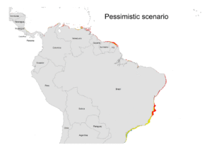 Figura 3. Modelos de distribuição do boto-cinza em dois cenários de mudanças climáticas para 2060: cenário mitigado (figura à esquerda) e não-mitigado (figura à direita). Nesses mapas as cores vermelhas indicam que aquela região representa um habitat adequado para a espécie no presente mas que se torna inadequado no futuro em cada cenário climático (Caribe, norte e nordeste do Brasil). As cores amarelas representam áreas que são adequadas no presente e continuam adequadas no futuro. As cores azuis representam áreas que não são adequadas no presente, mas que podem se tornar adequadas no futuro (algumas pequenas porções bem ao sul do Brasil). Quanto menos mitigado o cenário, maior a intensidade de perda de habitat.
